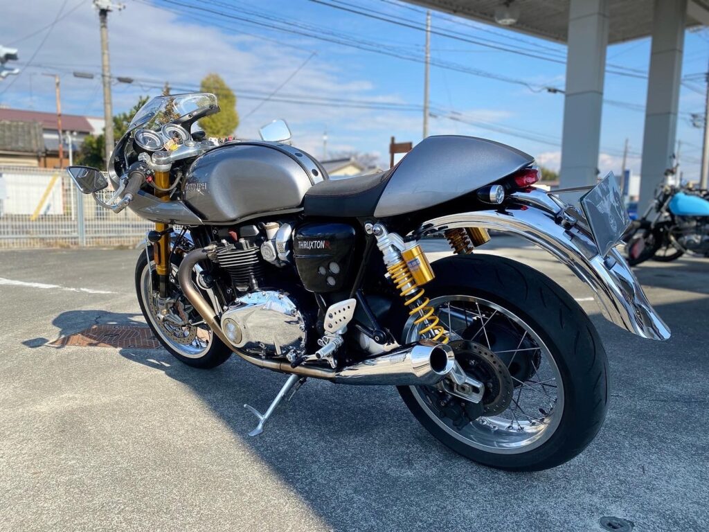 先週末に納車になりましたトライアンフのスラクストン。車両に合わせて製作した前後のフェンダーがアクセントになって一味違う車両になったかと思います(^^)今回はメッキ仕上なので見た目もビカビカに仕上がりま