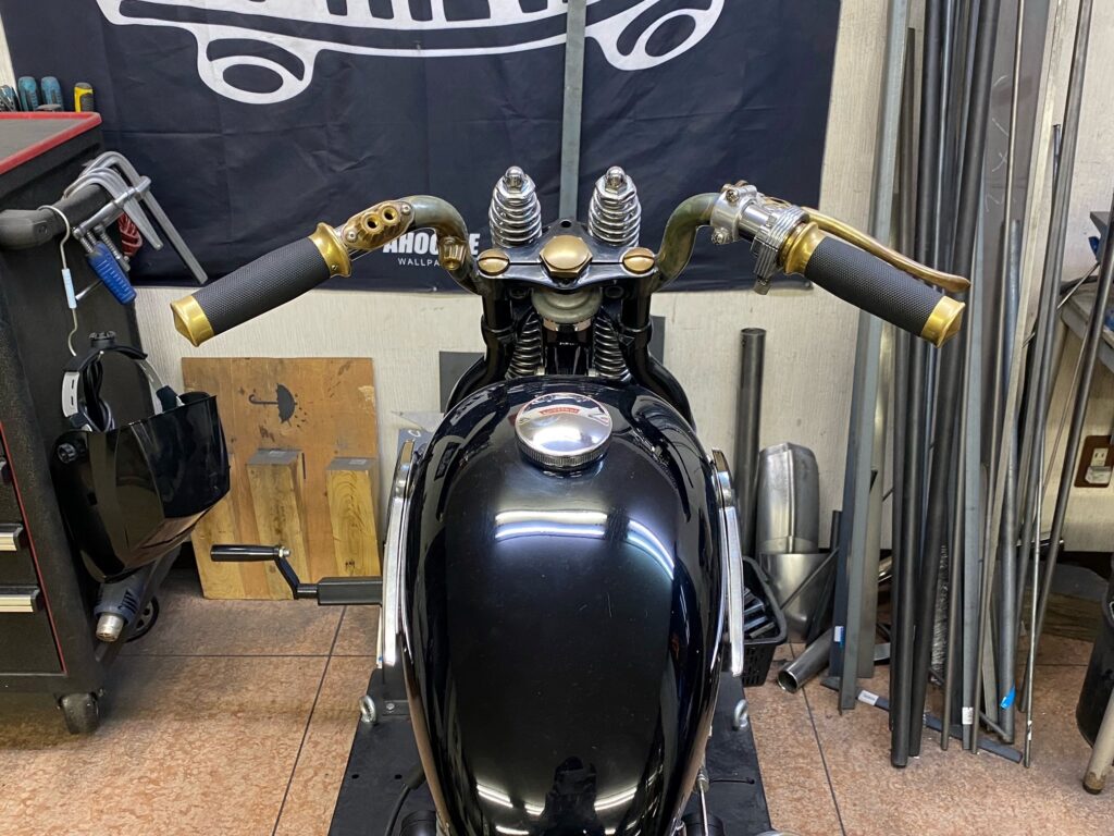 カスタムにてお預かりしているショベルリジッド、ハンドル制作が完了いたしました。オーナー様から極力ナローにしてほしいとのご要望だったので必要最低限の幅で製作しました。 ハンドルスイッチは使いたいとゆ