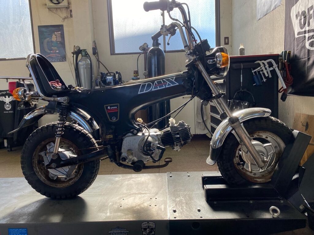 先日入庫したアメリカンDAXのカスタムを開始いたしました。 フロント周りを他車種のフロント周りを流用してフロントアップ&17インチ化しました。純正よりフォーク幅もナローになってスッキリしました(^^)